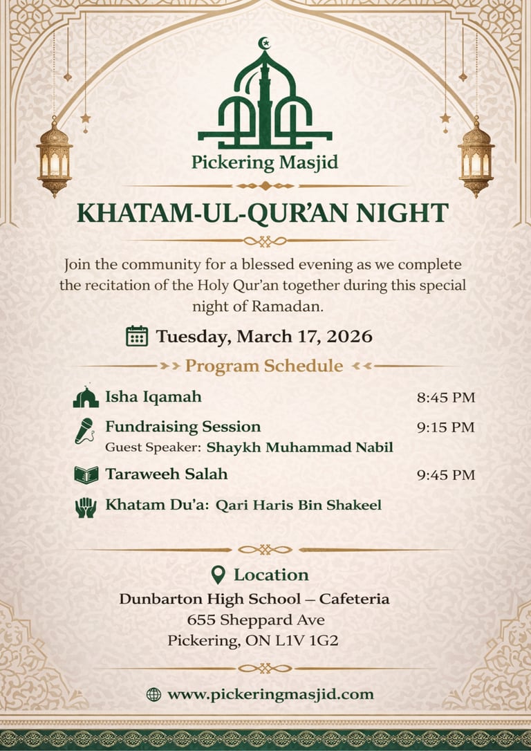 We are pleased to once again host Taraweeh prayers for the Pickering West community this Ramadan. To accommodate scheduling requirements, prayers will be held at two locations this year.
